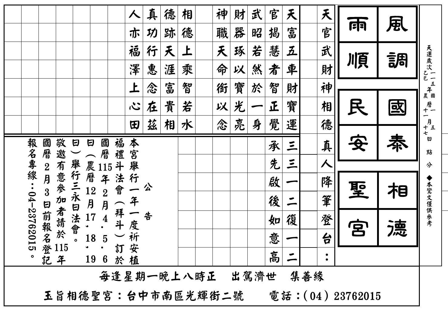乙巳年禮斗法會已開放登記,敬請諸位大德把握機會,若不確定該供奉哪個斗,可於濟世日詢問武財神