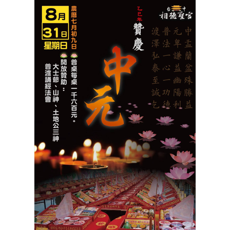 相德聖宮乙巳年中元普渡訂於國曆8/31舉辦,本宮規劃之普品,內容包含米、麵、油、鹽、餅乾、罐頭等乾糧,普品則可選擇親自領回、宅配寄送,或由本宮代為轉贈社福團體。敬邀十方善信共襄盛舉。