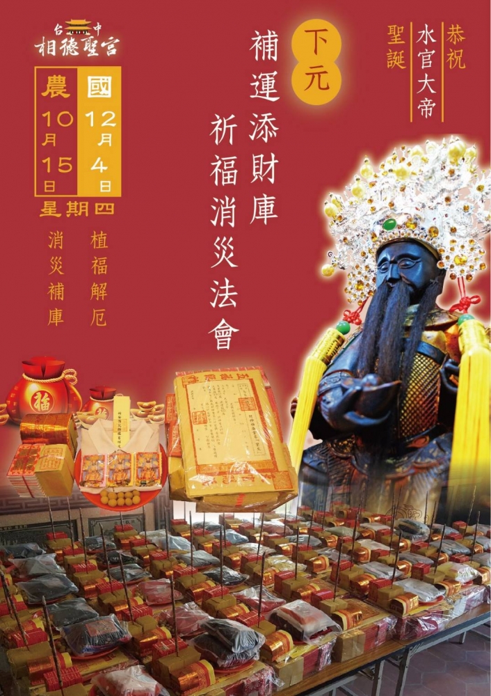 恭祝水官大帝聖誕【下元補運添財庫祈福消災法會】 乙巳年即將邁入尾聲,除去一整年的晦氣與阻礙,補添財庫、迎接新年好運! 由相德聖宮主神 天官武財神 親自主持,為善信消災解厄、轉運納福。