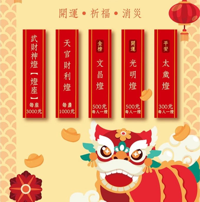【武財神燈座】、【天官財利燈】、【文昌燈】、【光明燈】開放登記。