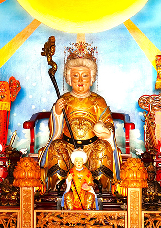 二樓主殿奉祀瑤池金母大天尊,為萬仙之母、靈界至尊,慈悲廣大,護佑世人。主司壽命延續、福澤綿長。信眾敬拜以祈求延年益壽、家庭圓滿、智慧開啟,亦為求子之重要信仰神祇之一。